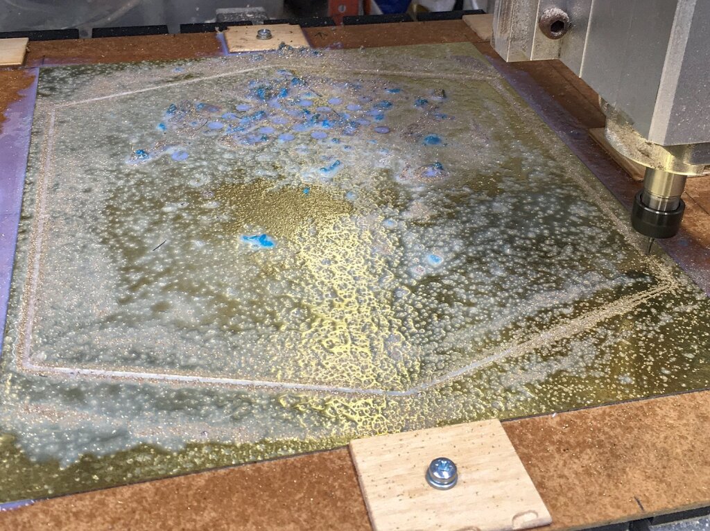 I used my CNC router to mill the perimeter, button holes, end bolt holes, hand rail holes, etc. on the brass end plate. This lets me locate the critical features very accurately, without routing the cosmetic piercings. The machine is rigid enough to cut brass accurately as long as I take light cuts with a sharp tool and use a water-based semi-synthetic cutting fluid, which I applied manually with a brush because the machine doesn’t have a flood coolant setup. The brass sheet was held to a sacrificial MDF board with blue tape and superglue, hence the blue paper gunk mixed in with the coolant and brass chips.