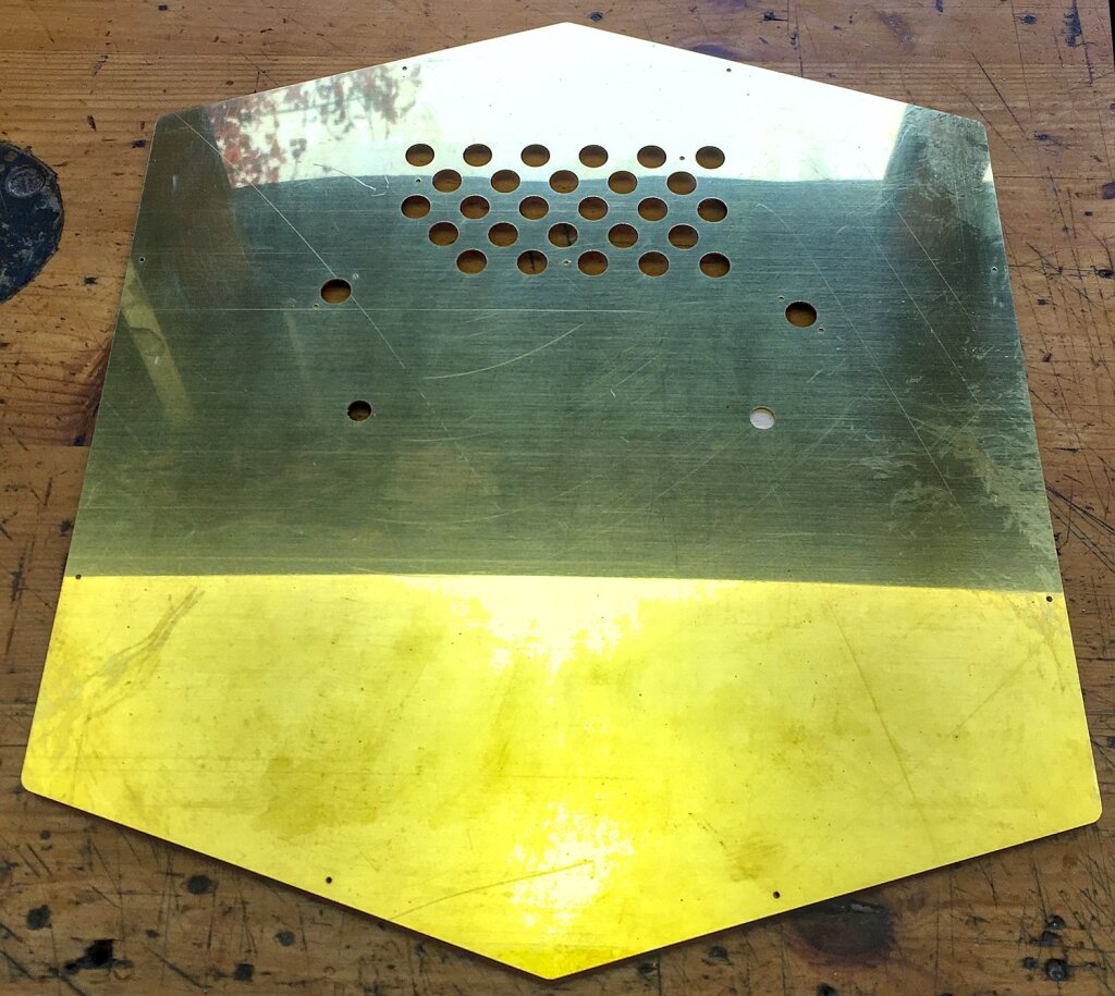 The button bushings were black, and the two C buttons had a texture engraved on the top to make them identifiable by feel (this picture was taken before the final polish). You can see in this one what I mean about the button heights appearing to be taller at the edges of the keyboard than in the middle because the end plate is raised in the middle but the tops of the buttons are level. I have seen the same effect on vintage instruments with similar raised ends.
