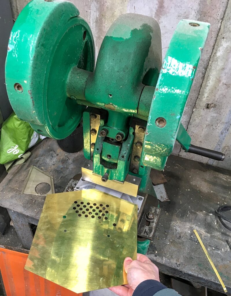To crimp the edges, I modified my existing press tool slightly so that it only crimps a short section at a time, and I have to manually control where it stops crimping on each edge (using lightly scribed guide lines). This was a bit tricky, especially when I managed to cut my hand by catching it between the press handle and the edge of the brass plate, which annoyingly also made a visible dent on the edge of the plate (the press handle is in exactly the wrong place: in future I want to figure out a way to modify it so the handle is at the top, well away from the workpiece).