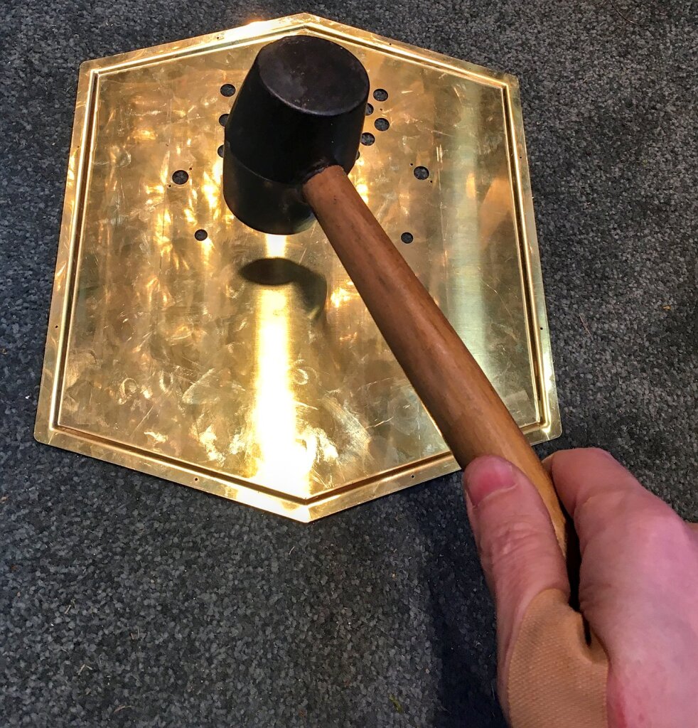 I wanted to try making the plate gently dome-shaped without making a wooden mould that would likely only be used once, so I had a go at manually beating it to a pleasing curve by hitting the back of it with a rubber mallet on top of some thick carpet. This isn’t as easy as it sounds because you also need to bend an opposing curve around the outside of the domed area so that the edges are flat.