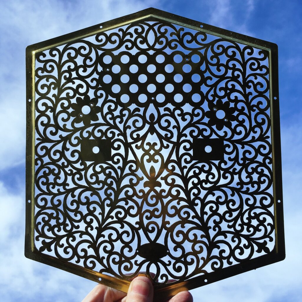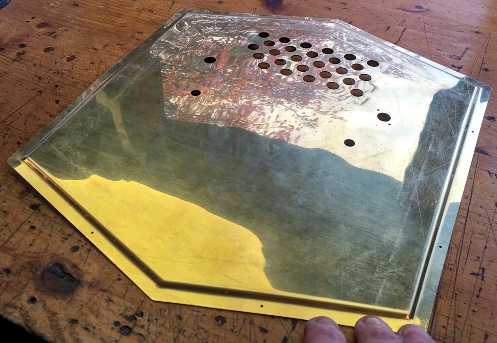 • Brass domed end plate with crimped border and extra-fancy fretwork.