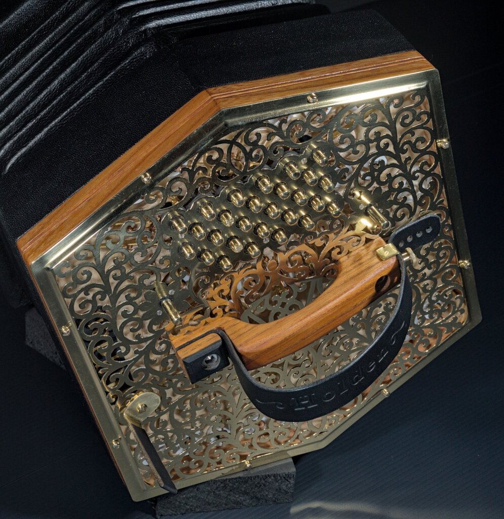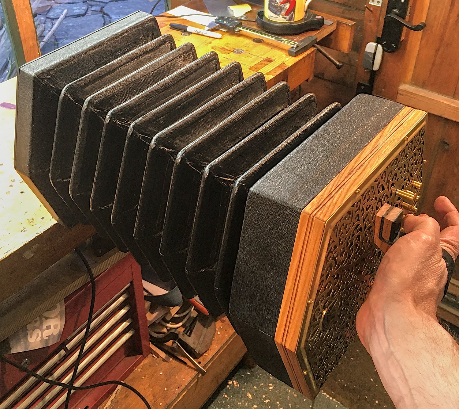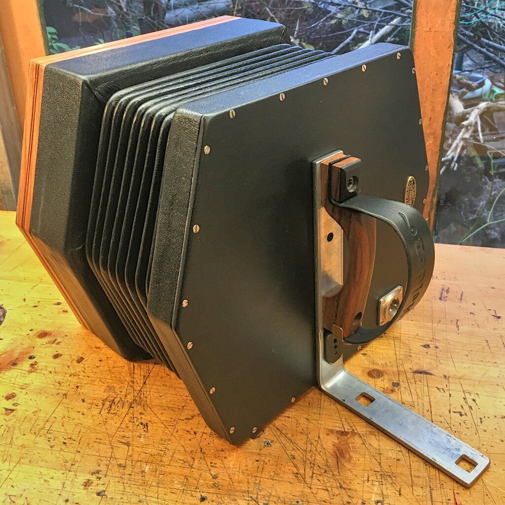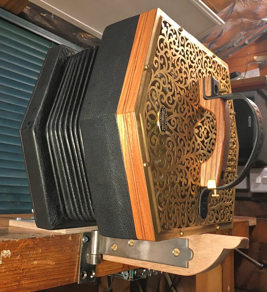 This instrument was a long term side-project that I finished off just in time for Christmas last year. It was an unusual project for me because I didn’t make the reeds (they are Hohner accordion bass reeds) or the bellows (they were reclaimed from a large Lachenal baritone Maccann), and it only has buttons and fretwork on one side. It was also the largest instrument I had built up to that point, and had the lowest bottom note (F1, 43.65 Hz).