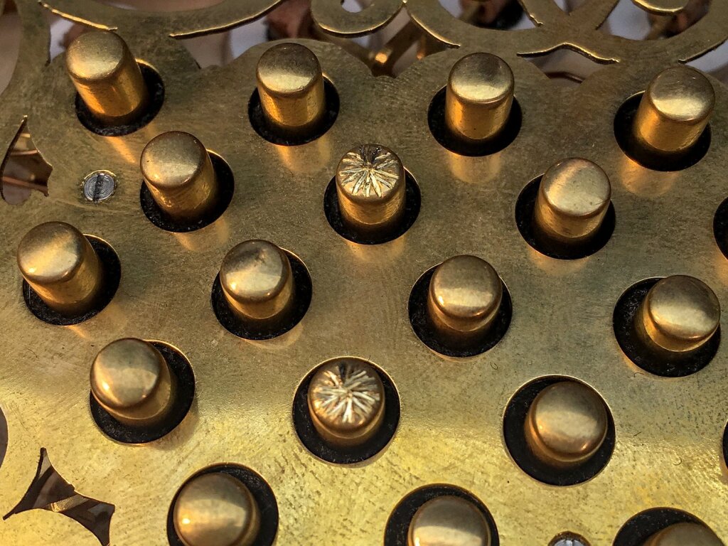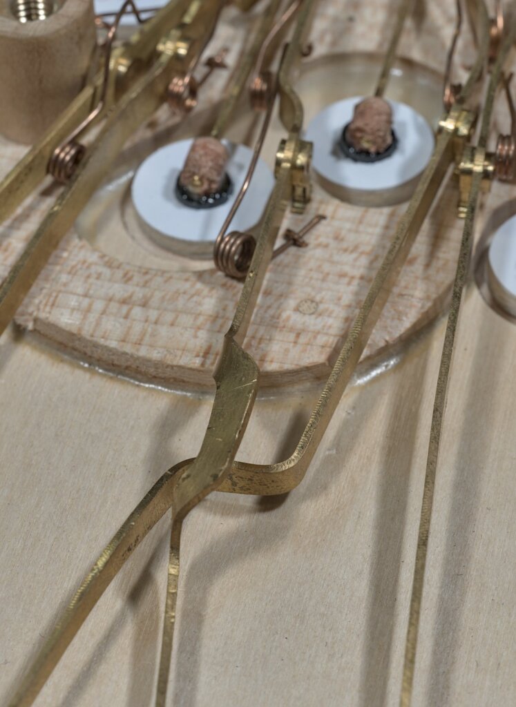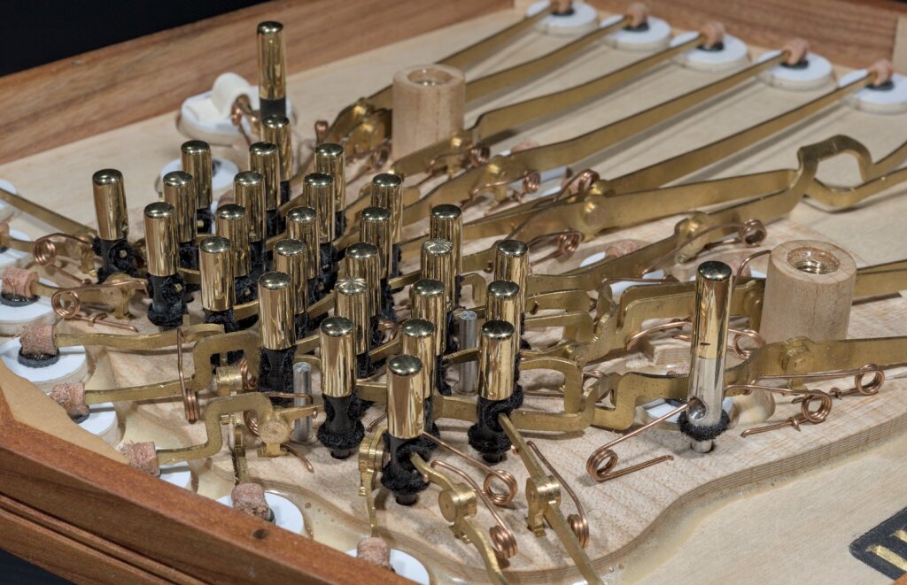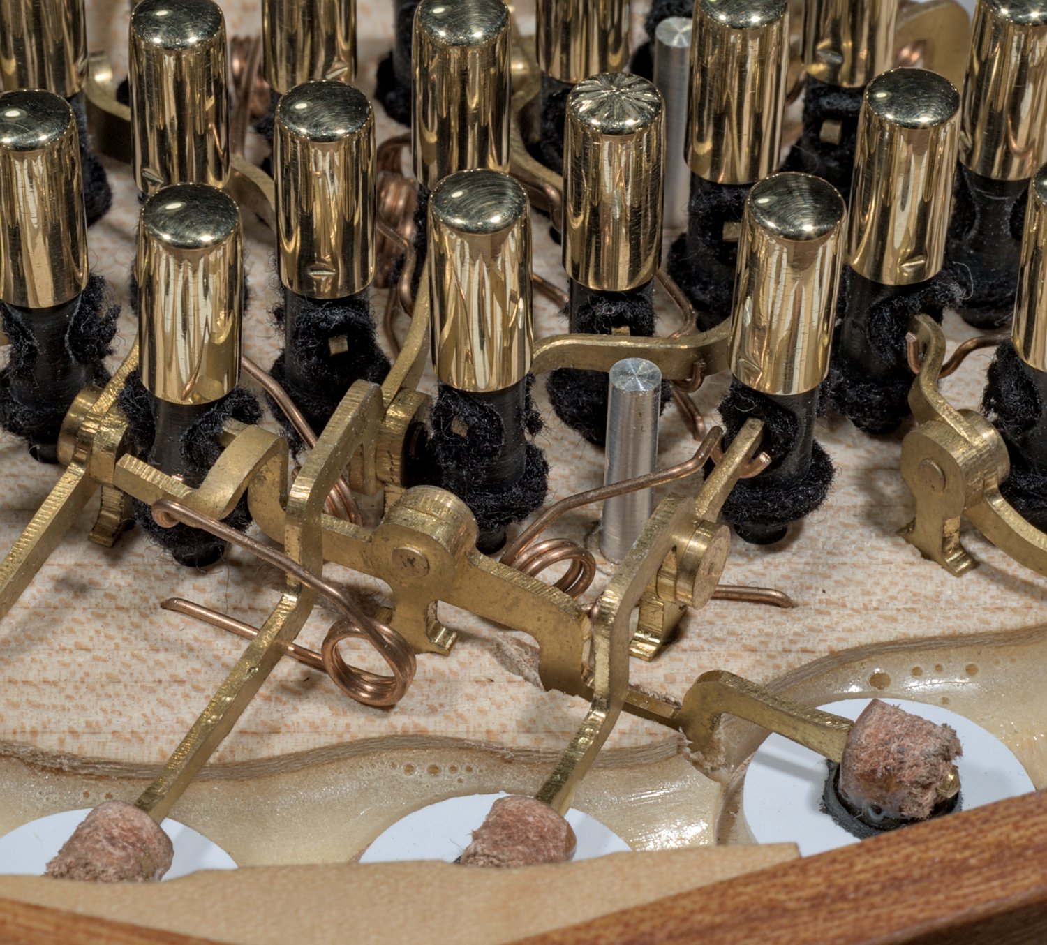 The button caps and external fittings were also brass, and the action box walls and hand rails were made from solid elm wood with an antique amber Peacock Oil finish.