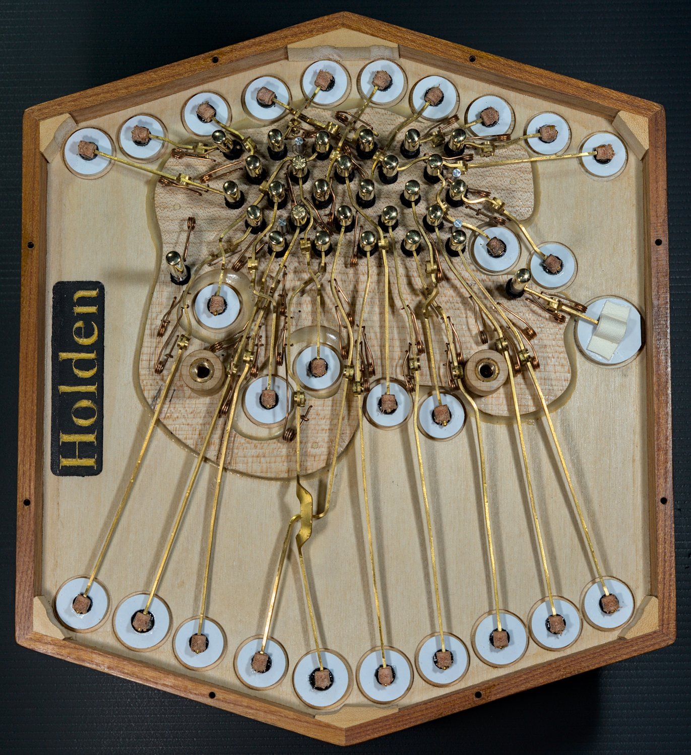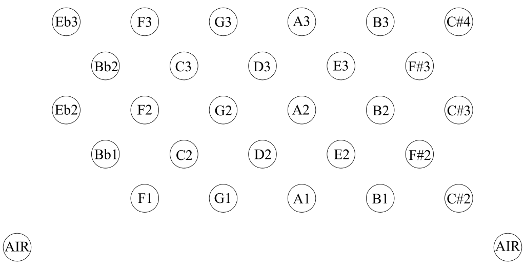 I put quite a bit of thought into the button layout. The bottom note (F1) was determined by how far I dared to tune down the reeds I had available. The number of notes I could fit in (27) was limited by how many reed plates I could fit flat on the reed pan (I didn’t want to use accordion-style perpendicular reed blocks), which in turn was determined by the size of the reclaimed bellows. The way the Hayden layout works is that adding columns to the left side adds flat notes to the scale and adding columns to the right side adds sharp notes. Hayden keyboards aren’t necessarily (in fact often aren’t) fully chromatic over their range, because a complete ideal Hayden keyboard is quite wide due to the duplication of enharmonic notes (e.g. D# and Eb) on opposite sides of the layout. I wanted it to have a useful range in every playable key. After some discussion with my client, I determined that he would like to be able to play in common folk music keys (like G and D), F because that’s the lowest note it has, and ideally also Bb because he is interested in brass band music. That implied including buttons for two flats and two sharps, though it was possible to skip the Eb1 as I don’t think it would have been particularly useful. You may notice that there are no buttons for G# or Ab, which means the scale is not fully chromatic. It has about 2 1/2 octaves in every easily-playable key, which makes it fairly useful and versatile within its limitations. Due to its low range I believe it will mostly be used to accompany other instruments rather than for solo playing. You could think of it as being a bit like the left hand of a normal duet concertina, except shifted down by three rows (about 1 ½ octaves).