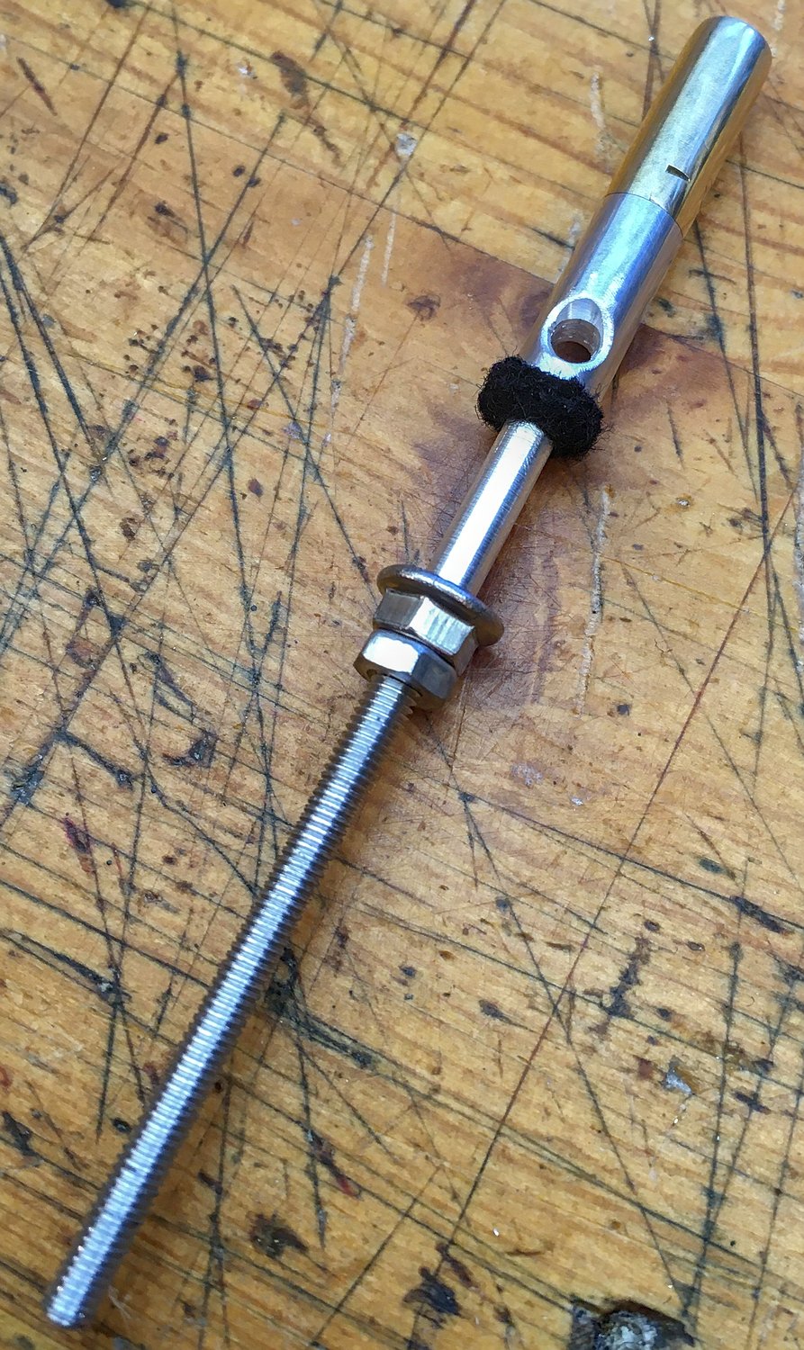 The bottom part of the air button core is actually a long pushrod that goes through the action box, where a flange nut (with an O ring, not shown in the photo) locked by a conventional nut is used to prevent the button rising too far. Below that the threaded rod carries on all the way through a small hole in the reed pan.