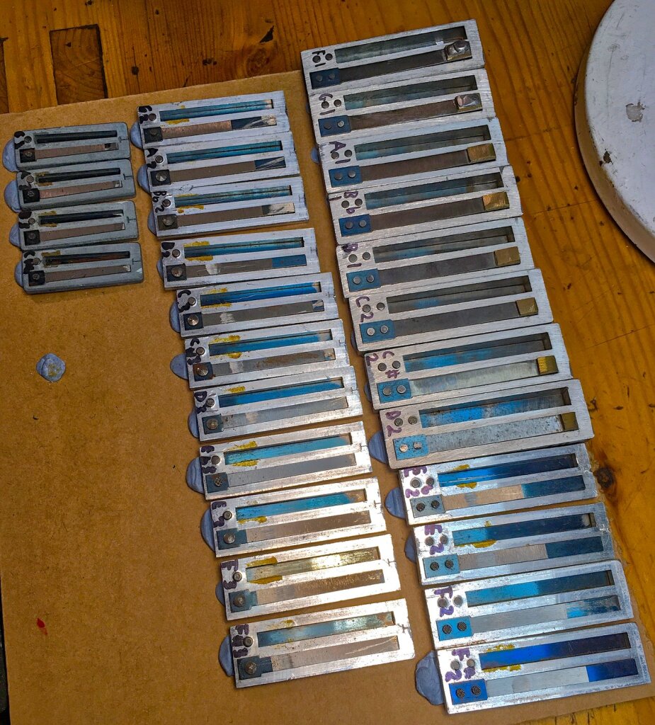 This was the first instrument I have built with factory-made accordion reeds rather than hand-made concertina reeds. The bottom 12 pitches were large new-old-stock Hohner bass reeds bought from a fellow squeezebox restorer. The rest of the reeds were second-hand, salvaged from a set of Hohner accordion bass reed blocks I bought on eBay. The lowest reeds I had available were G#1, so I made the F1 and G1 by adding extra solder to the existing brass tip weights. There were four different sizes and thicknesses of reed plate. They were all aluminium (or maybe duralumin? I’m not sure) apart from the top four pitches, which appeared to be zinc. (Picture taken before I had cleaned them.)