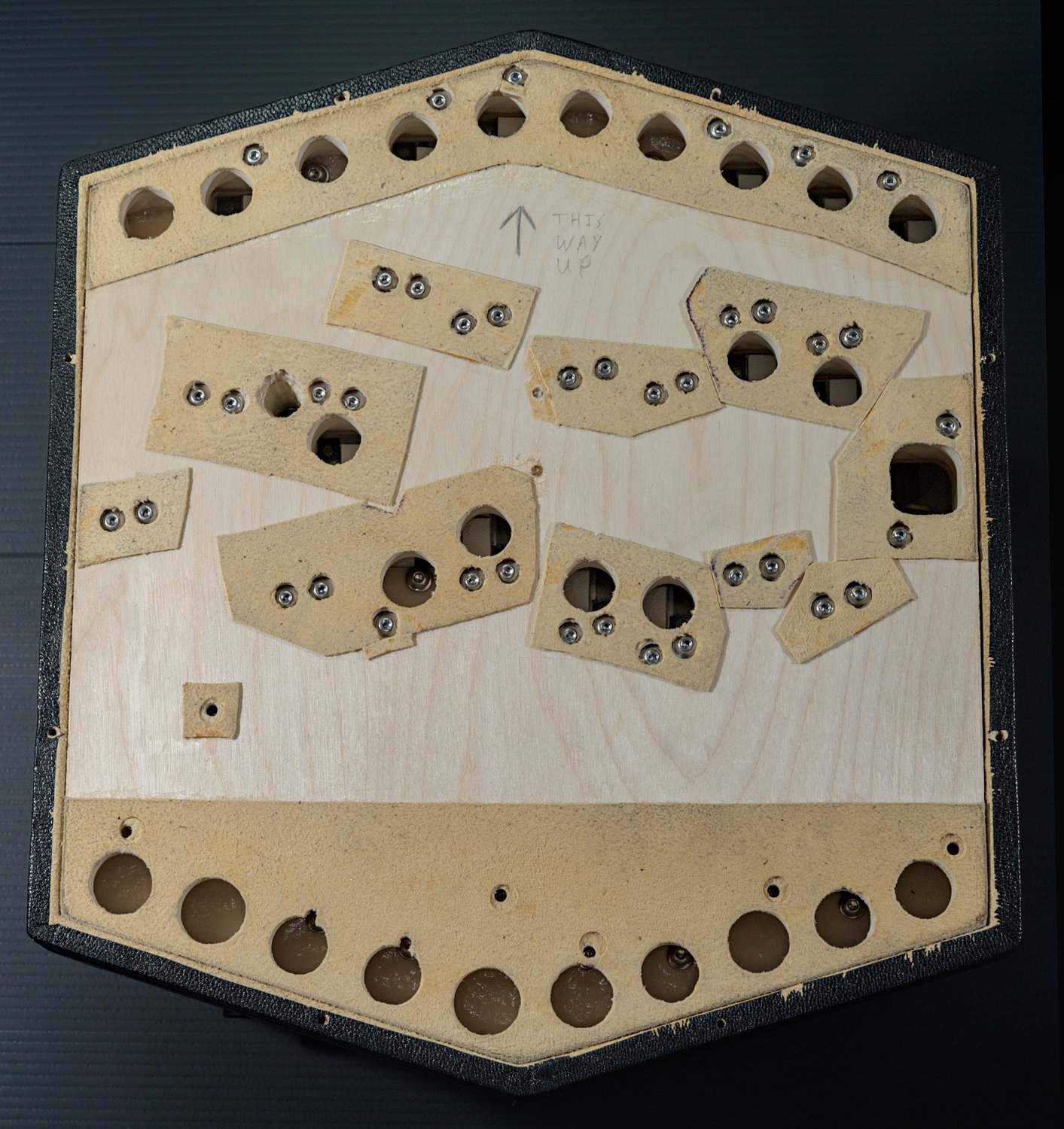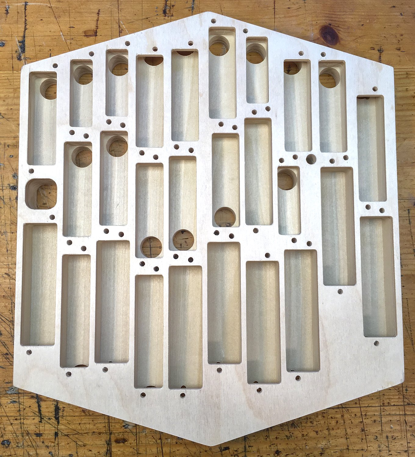 I didn’t want to use accordion-style perpendicular reed blocks, so I arranged the reed plates on a flat reed pan. The design of the pan took some inspiration from other hybrid concertinas I have seen, with a few differences. In particular, many of the bass reed chambers needed to be longer than the reed plate to perform adequately, which complicated the construction somewhat. I decided to make a separate pan rather than integrating it with the bottom of the action box for ease of construction and maintenance. It was constructed sandwich-style, with 3mm birch ply on the top and bottom and 13.5mm of American poplar in the middle, laminated together with epoxy resin.