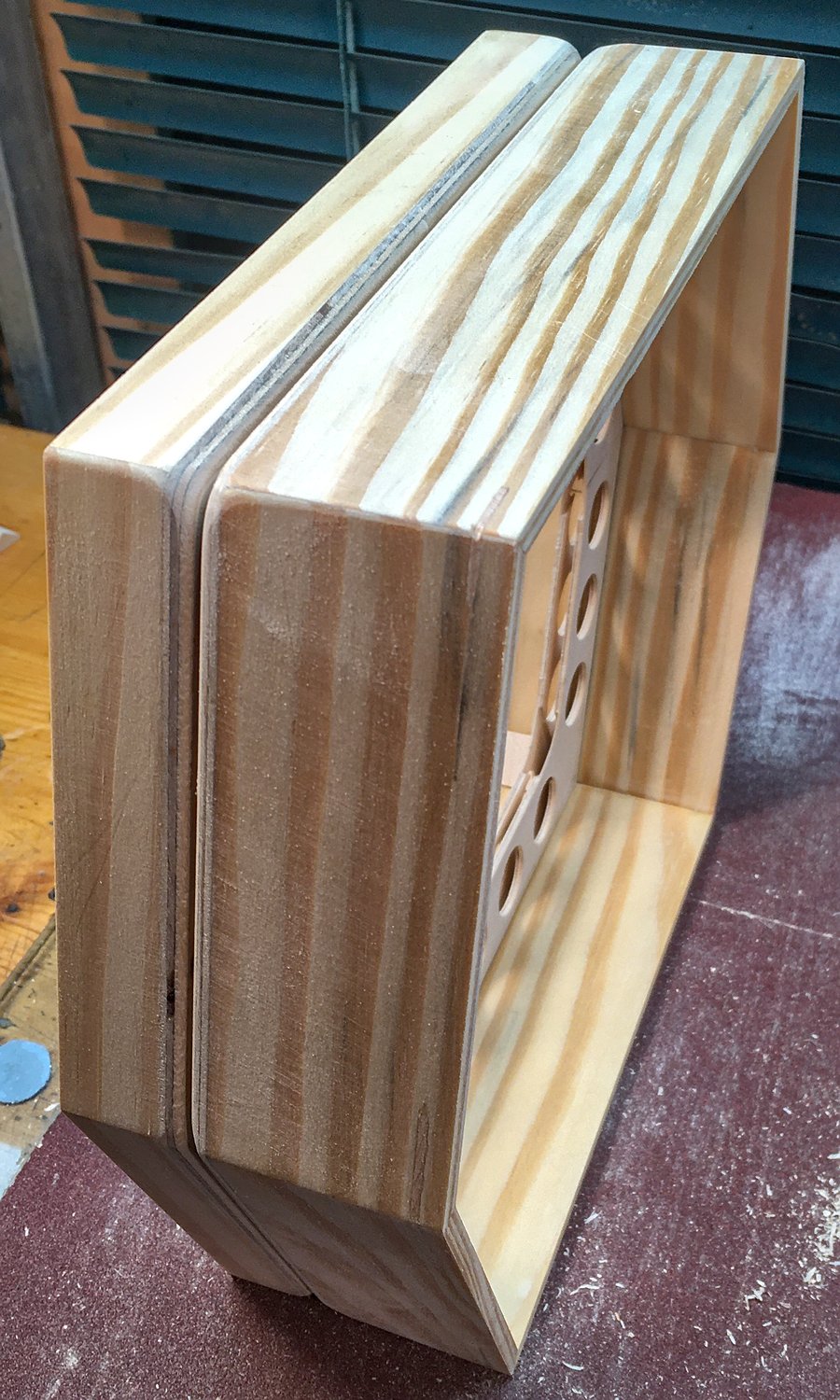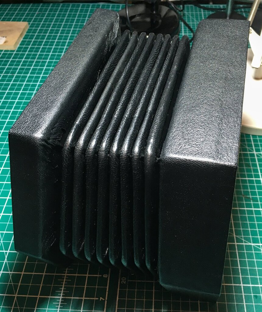 The bellows side of the plywood had rebates cut into it for the cards and the gusset folds. The other benefit of the plywood is that it ensures the folds can’t push into the space inside the frames and potentially contact the reeds. The holes were just there to lighten them a little bit.