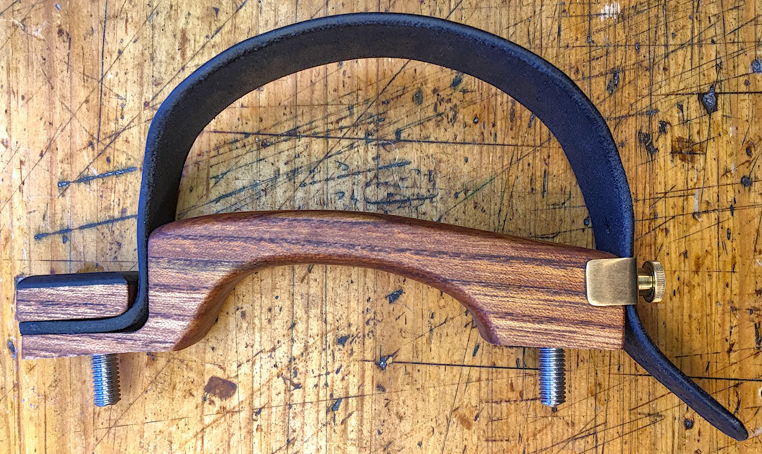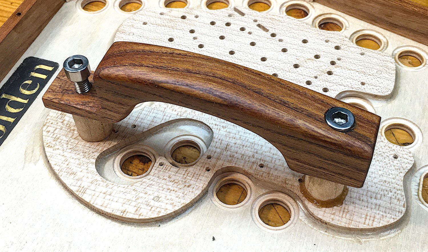 The hand rails were wider than usual and curved for comfort. I made them from solid elm wood and finished them with Peacock Oil like the action boxes. They were arch shaped, partly for cosmetics and partly to expose the fretwork piercings beneath the middle of the hand rail and the four pads beneath them. The one on the action box end had to have curved feet to match the raised shape of the end plate, whereas the one on the blank end had flat feet.