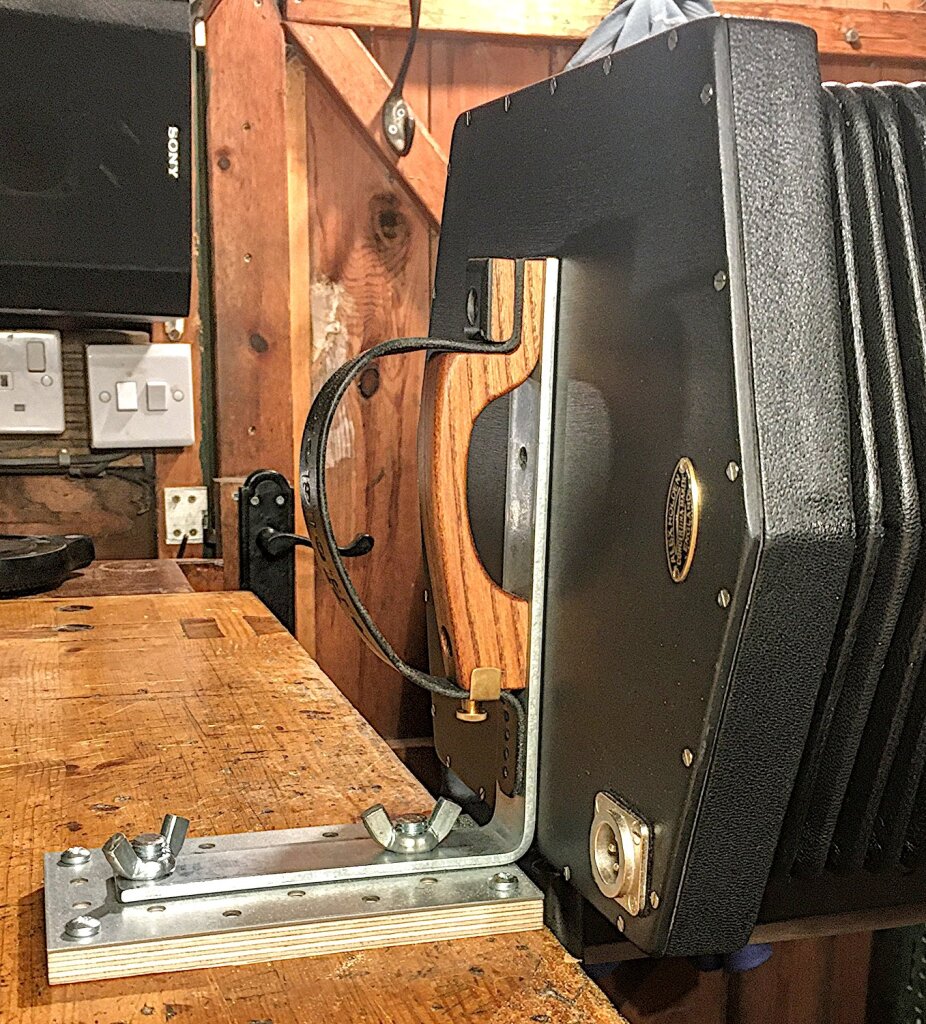 The bench mount bracket was an idea my client had that allows the instrument to be played one-handed with the blank end attached to the end of a bench. This frees the player’s other hand to simultaneously play a different instrument, e.g. a synthesiser. Because the captive nuts are arranged symmetrically it can be assembled either way round, for either right or left-handed playing. It was designed to be disassembled and reassembled quickly so the instrument can be easily transported. The system is made up of several pieces: a steel L bracket that mounts to the blank end of the instrument beneath the handrail, a block with two M6 studs and a pair of wing nuts that screws to the top of the bench and the L bracket bolts onto, a hinge pintle that screws onto the end of the bench, and a hinged wooden support that the action box can be rested on while not actively playing the instrument.