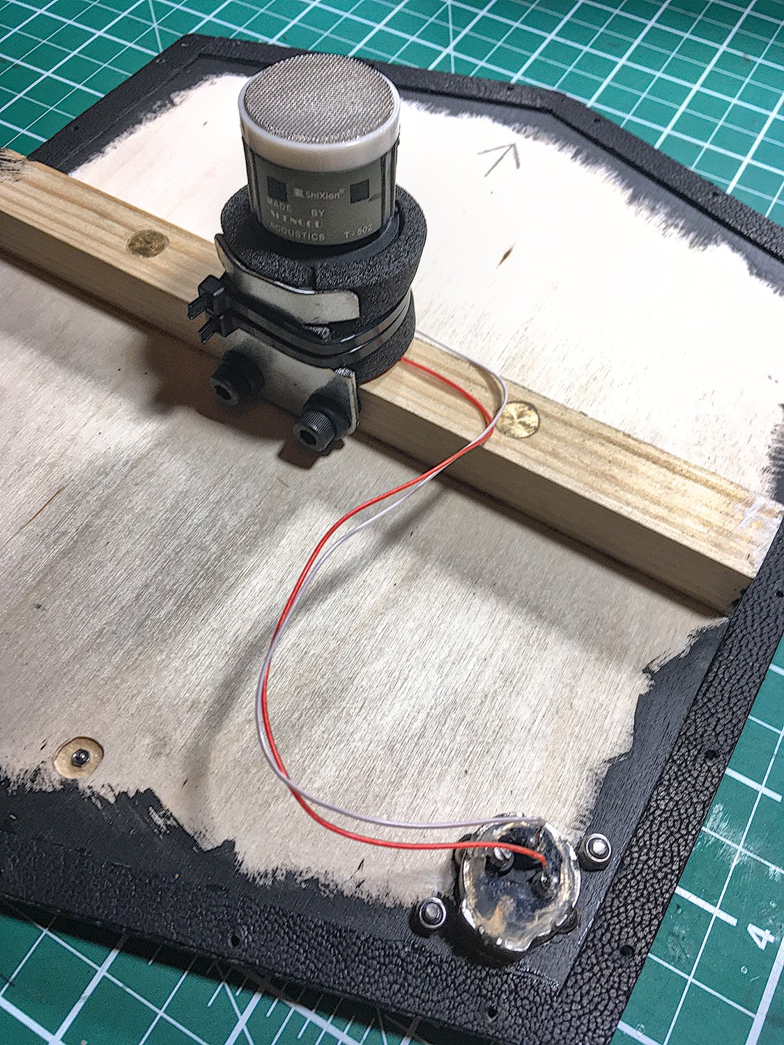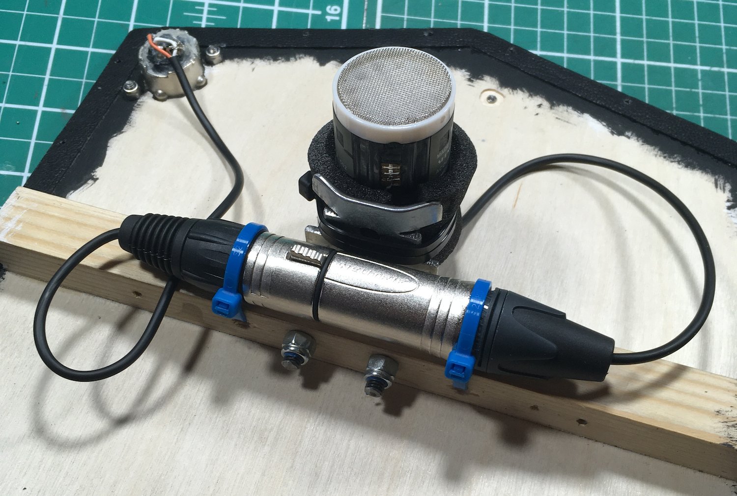 My client wanted me to include a built-in microphone pickup both for amplification when playing live, and to feed into a chain of effects pedals. I thought this would be a simple task but it actually proved to be the hardest part of the project. My first thought was that I could mount the mic inside the instrument. It would need to be securely attached with a shock-absorbing mount so that the sensitive capsule didn’t get damaged if the instrument got knocked around a bit. I also thought a dynamic capsule would be a good idea because they are said to be more robust and less prone to feedback than condenser mics, and also they are simpler to hook up to other equipment because they don’t contain any active electronics that need to be powered by phantom power or an internal battery. Because the mic would be inside the instrument, the connection (preferably a standard XLR socket) would need to be on the outside without introducing an air leak in the process.