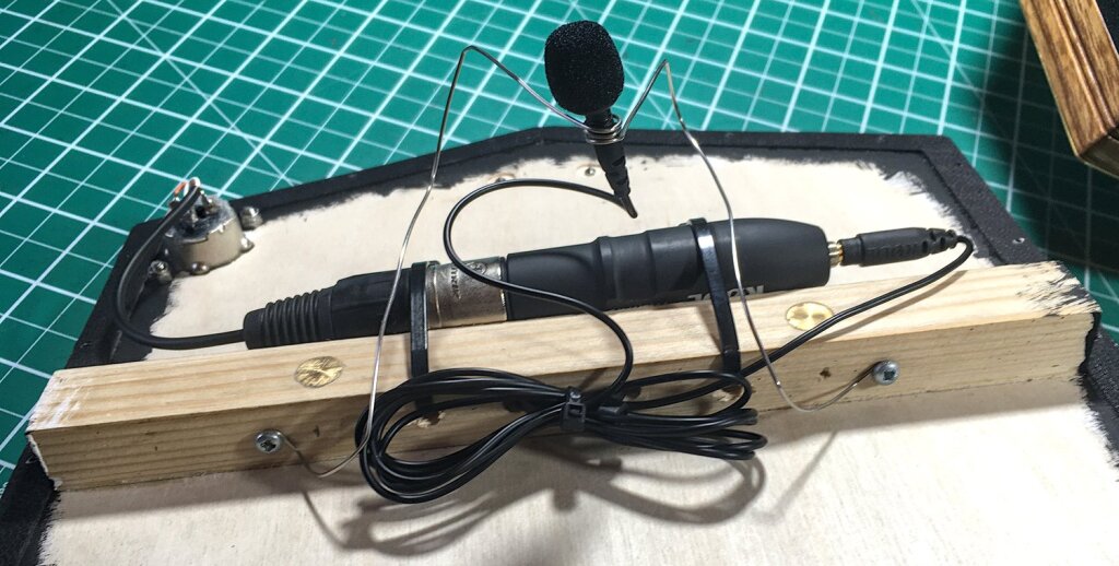 Sixth attempt: after discussing and sharing audio recordings with my client, what we decided to do was to reinstate the internal dynamic cartridge and also come up with a way to mount the lavalier outside the bellows. That way the distorted but feedback-resistant internal dynamic mic can be fed into the effects chain, and some proportion of the clean-sounding dry signal from the external lavalier mic can be mixed into the output.