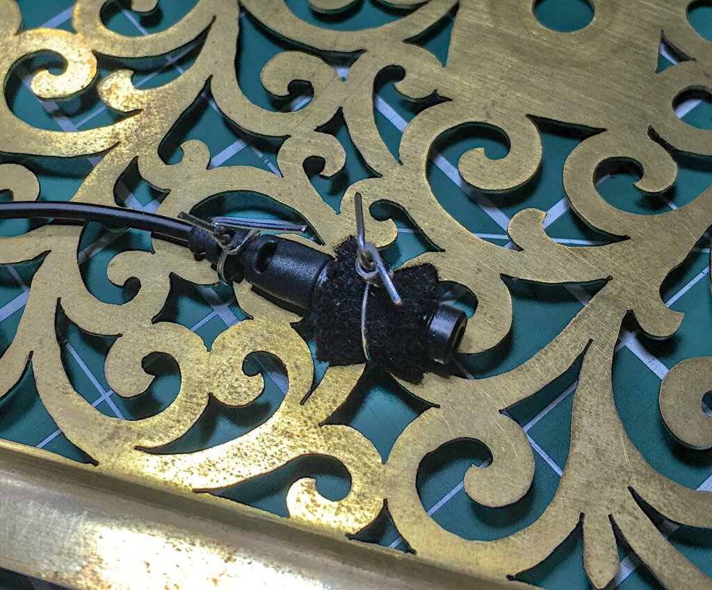 Fifth attempt: I bought a different brand of mic and phantom power XLR adapter (a Rode Lavalier Go and a Rode VXLR Pro) from a UK-based camera dealer. I was getting a bit paranoid at this point and half-expected it to arrive badly-packed and broken, but it was fine and in initial testing outside the instrument the recordings sounded very nice. I then tried mounting it inside the instrument. This was a little fiddly because, to avoid modifying the XLR adapter, I wired in an internal XLR plug. I also made a shock mount for the mic from stainless steel wire.