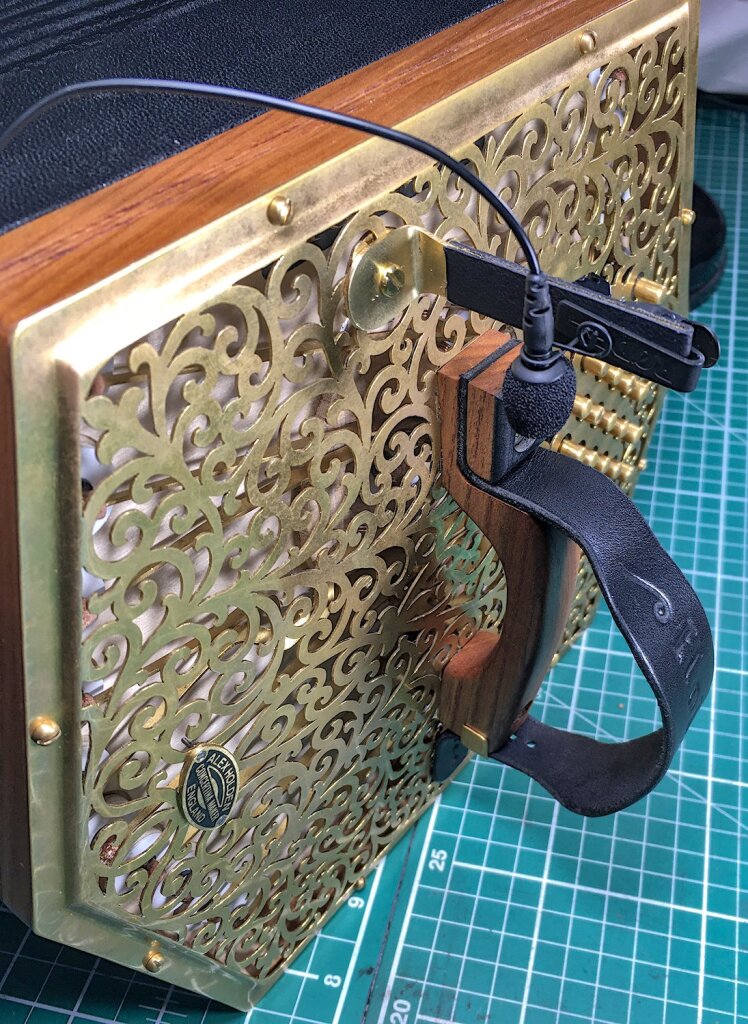 Seventh and final attempt: I took the mic back out from inside the action box and tried holding it in various places near the end while playing notes and listening to the mic live through headphones. I found a reasonable compromise in terms of balance was to place it close to the base of the thumb (when playing right-handed). The mic came with a lapel clip, so I made a removable leather-covered brass L bracket that bolts to the end plate and provides something to clip the mic onto. The idea is that the adapter and the bracket can remain semi-permanently bolted to the instrument but the mic itself can be stored separately and only attached when it’s actually being used.