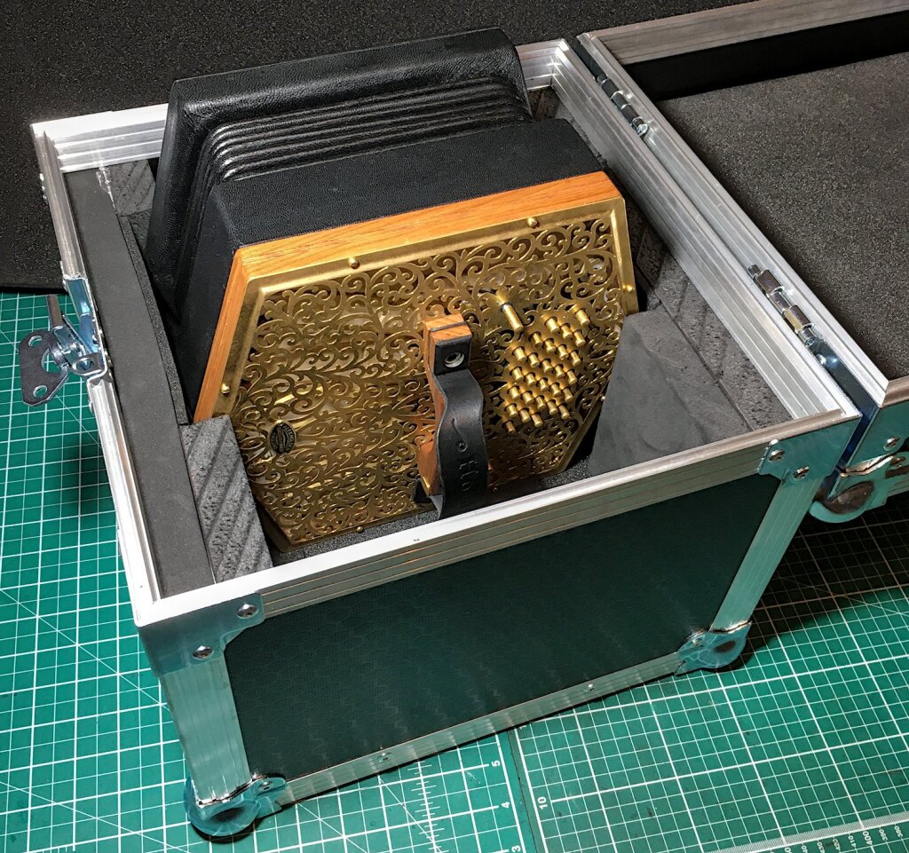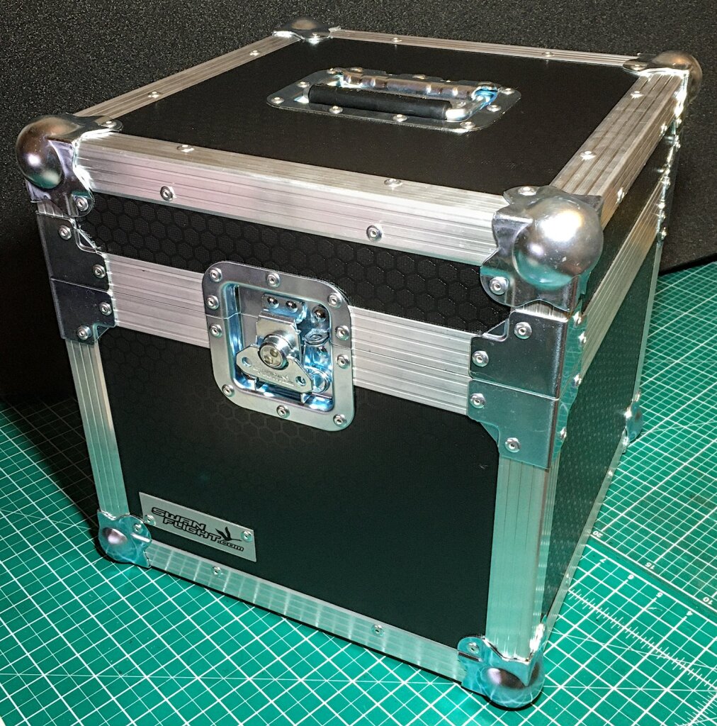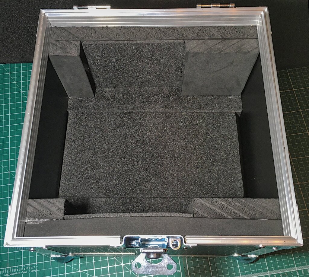 The case needed to be sturdy enough to survive touring. After some thought and research we decided to go with a professional flight case. Rather than have one custom made, I found the SwanFlight LP100 (made to hold 100 12″ records) was only a bit oversize. It isn’t the most beautiful or lightest case I have supplied with an instrument but I think it might the most robust.