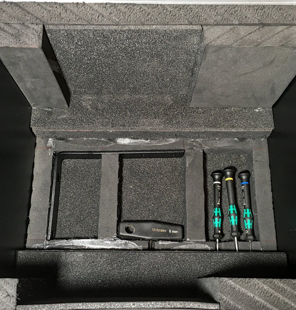 A section of the floor lifts up to reveal hidden compartments that hold various maintenance tools and the L bracket for mounting the instrument to a bench.