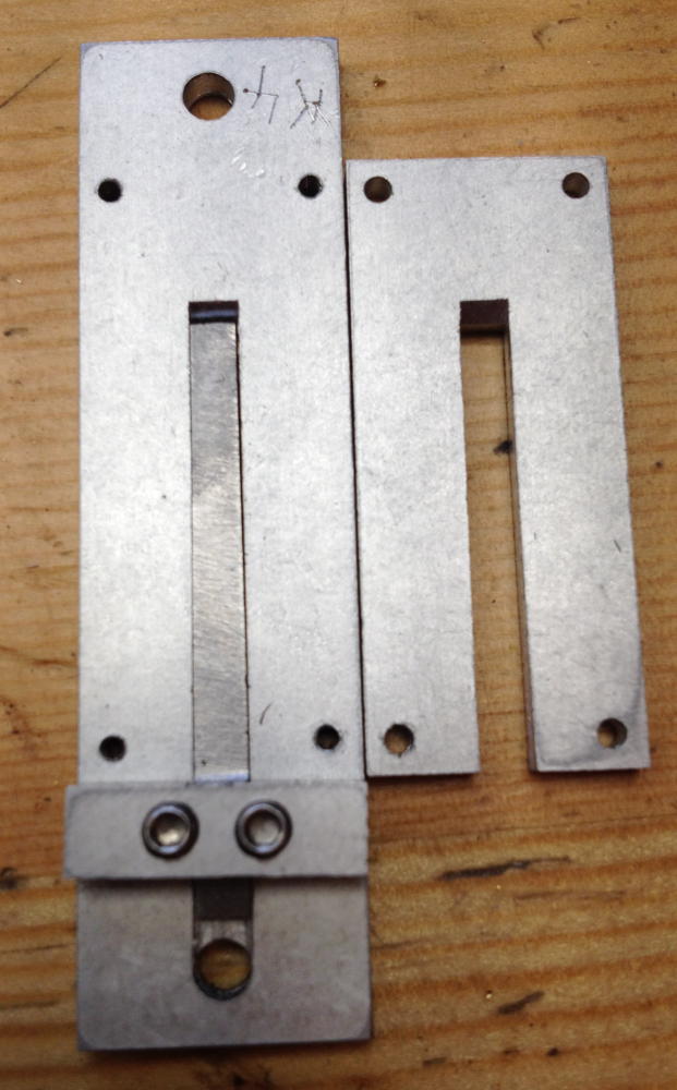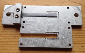 The solution was to make a thinner fixture that (just) allowed the blank to fit under the Z slide. The two small holes in the middle of either end match with registration pins in the spoilboard, thus allowing the blank to be flipped over and still be in the same position, so the bottom reed slots end up in the right place relative to their chambers.