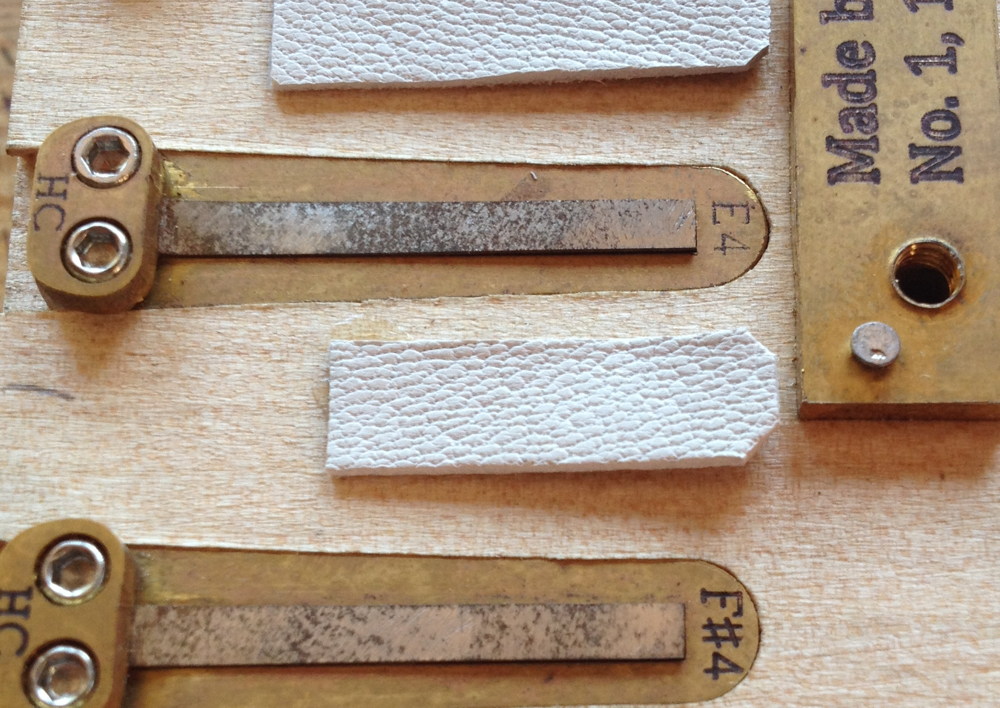 On advice from several other makers, I ordered some hides of Columbia Pneumatic Leather from Columbia Organ Leathers (who are based in a town called Columbia, Pennsylvania, not the Republic of Columbia). It’s not cheap but it’s nice stuff. I removed all the previous valves (I found the easiest way was to just rip them off, then use hot water to remove the remnants of the old glue) and cut a new set, mostly from the extra heavy weight hide, though I did use the heavy weight for the higher notes. It was recommended to me to wash the leather and dry it on a sheet of glass to make it a bit stiffer, but I couldn’t tell any difference before and after washing (maybe I did it wrong). For the most part, the new valves behaved much better and solved the problems I was having. A few of them misbehaved in testing, not always for obvious reasons, but replacing them solved the problem.