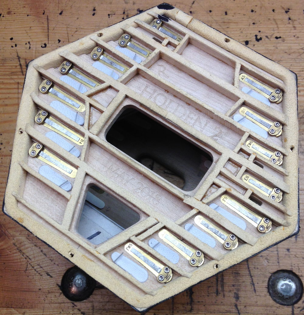 A few weeks ago I completed my second new concertina. For pragmatic reasons I chose to build an example of what is probably the most popular type of concertina sold today: the 30 button 1 C/G Anglo in a 6 ¼” hexagonal frame. I decided to name this model (and variations on it) the Holden Blackbird in honour of the small family of blackbirds that sing and dance on the roof of my workshop while I am building instruments (no photos of the birds, unfortunately: they are very camera-shy).